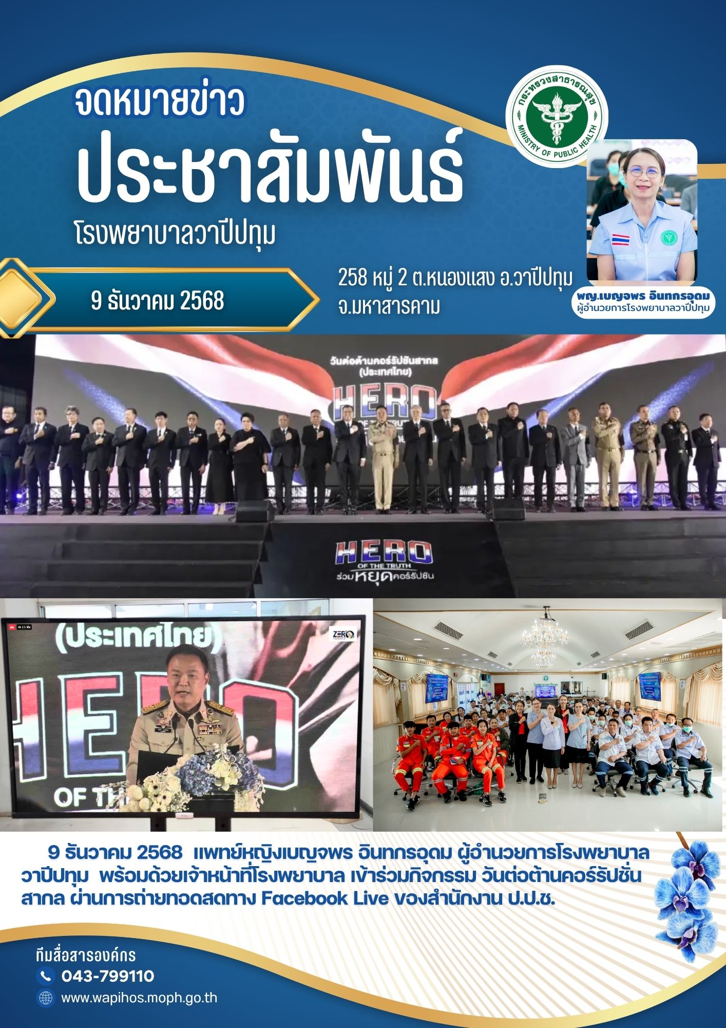 9 ธันวาคม 2568 แพทย์หญิงเบญจพร อินทกรอุดม ผู้อำนวยการโรงพยาบาลวาปีปทุม พร้อมด้วยเจ้าหน้าที่โรงพยาบาล เข้าร่วมกิจกรรม วันต่อต้านคอร์รัปชั่นสากล ผ่านการถ่ายทอดสดทาง Facebook Live ของสำนักงาน ป.ป.ช.